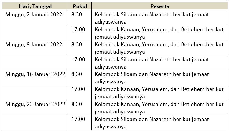Mulai tahun 2022 ibadah mingguan akan dilaksanakan dua kali yaitu pukul 8.30 wib dan pukul 17.00 wib dengan pembagian kelompok dalam setiap ibadah. Sedangkan jadwal Ibadah di gereja selama bulan Januari 2022 adalah: